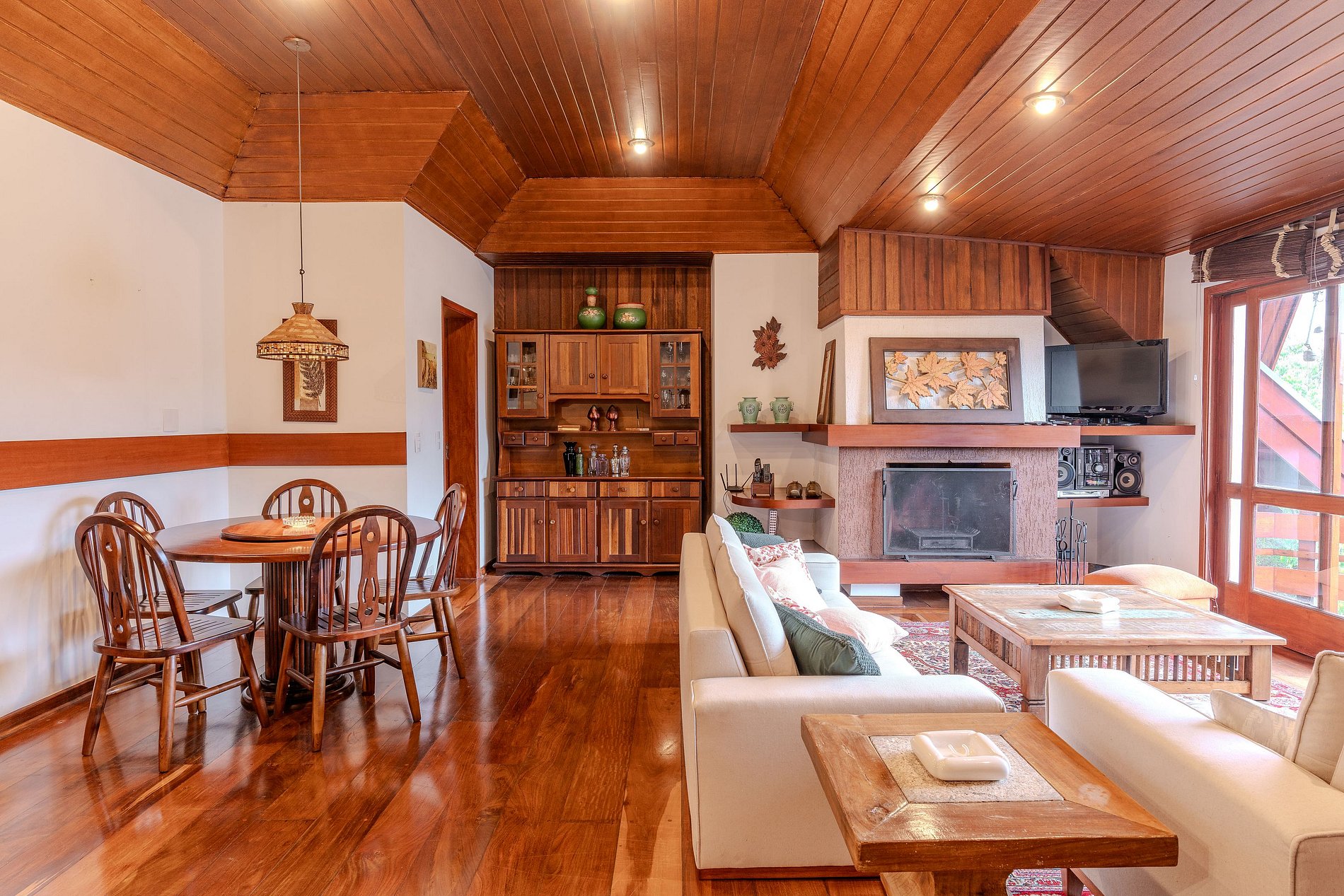 Ambiente aconchegante, todo decorado para proporcionar uma experiência singular. Os móveis e a lareira criam o ambiente perfeito para passar os dias de frio com muito estilo no inverno.