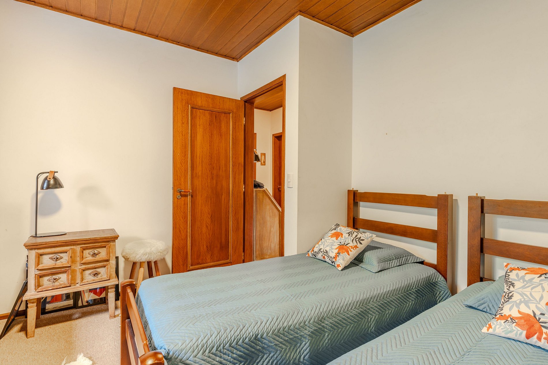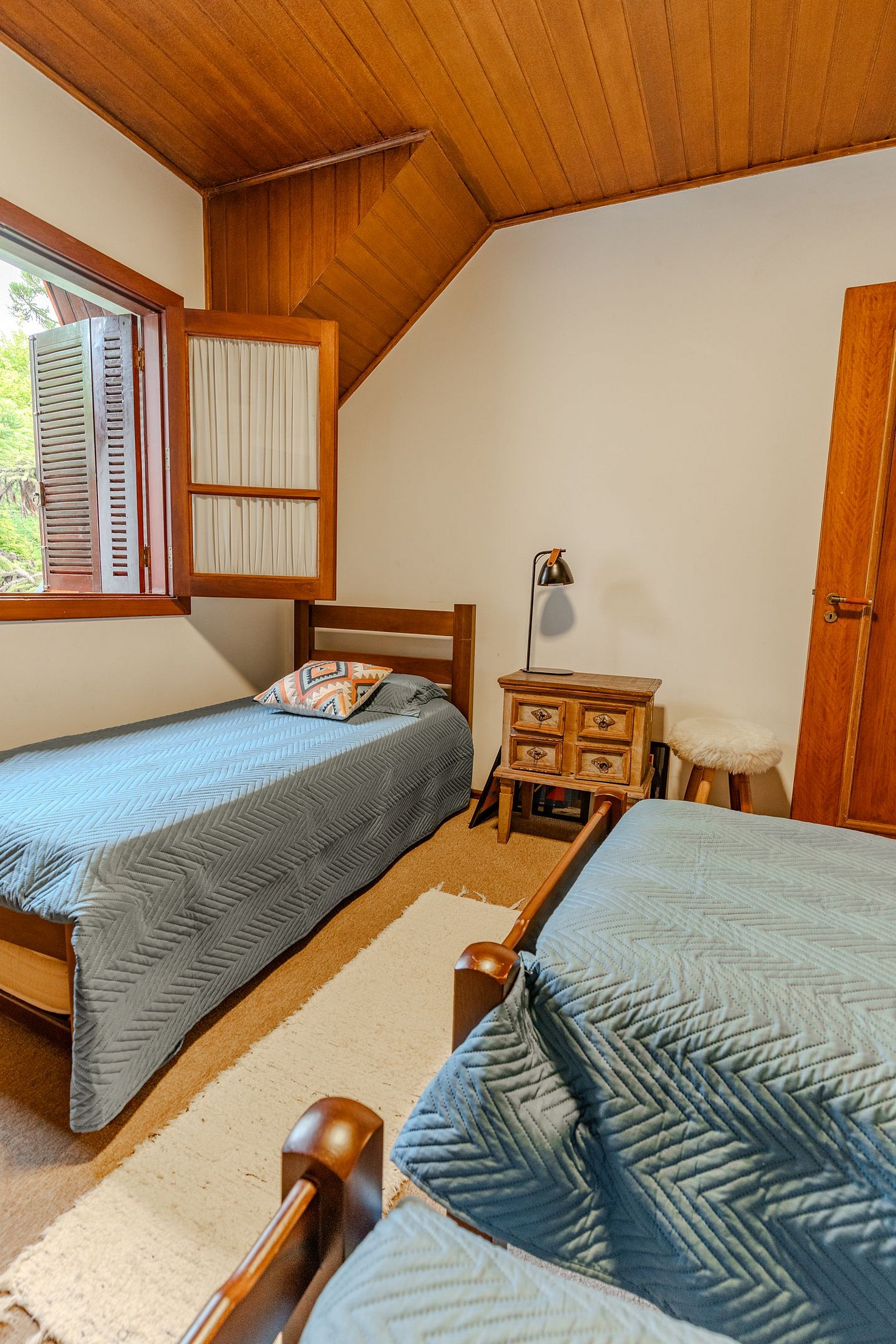 A suíte principal conta com uma belíssima cama de casal, a outra suíte têm 3 camas de solteiro e o terceiro quarto possui 2 camas de solteiro e uma caminha auxiliar com colchão que fica embaixo de uma das camas.