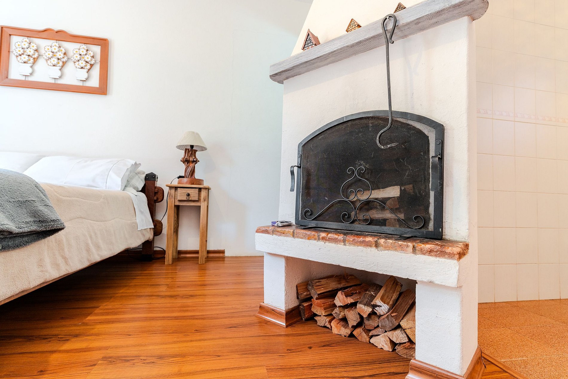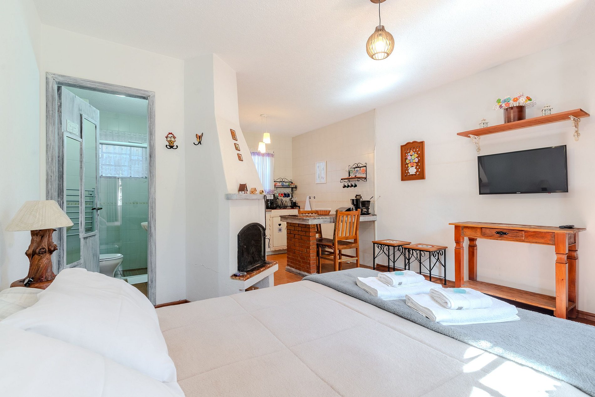 Chalé em formato kitnet com uma cama de casal, smart TV e lareira.