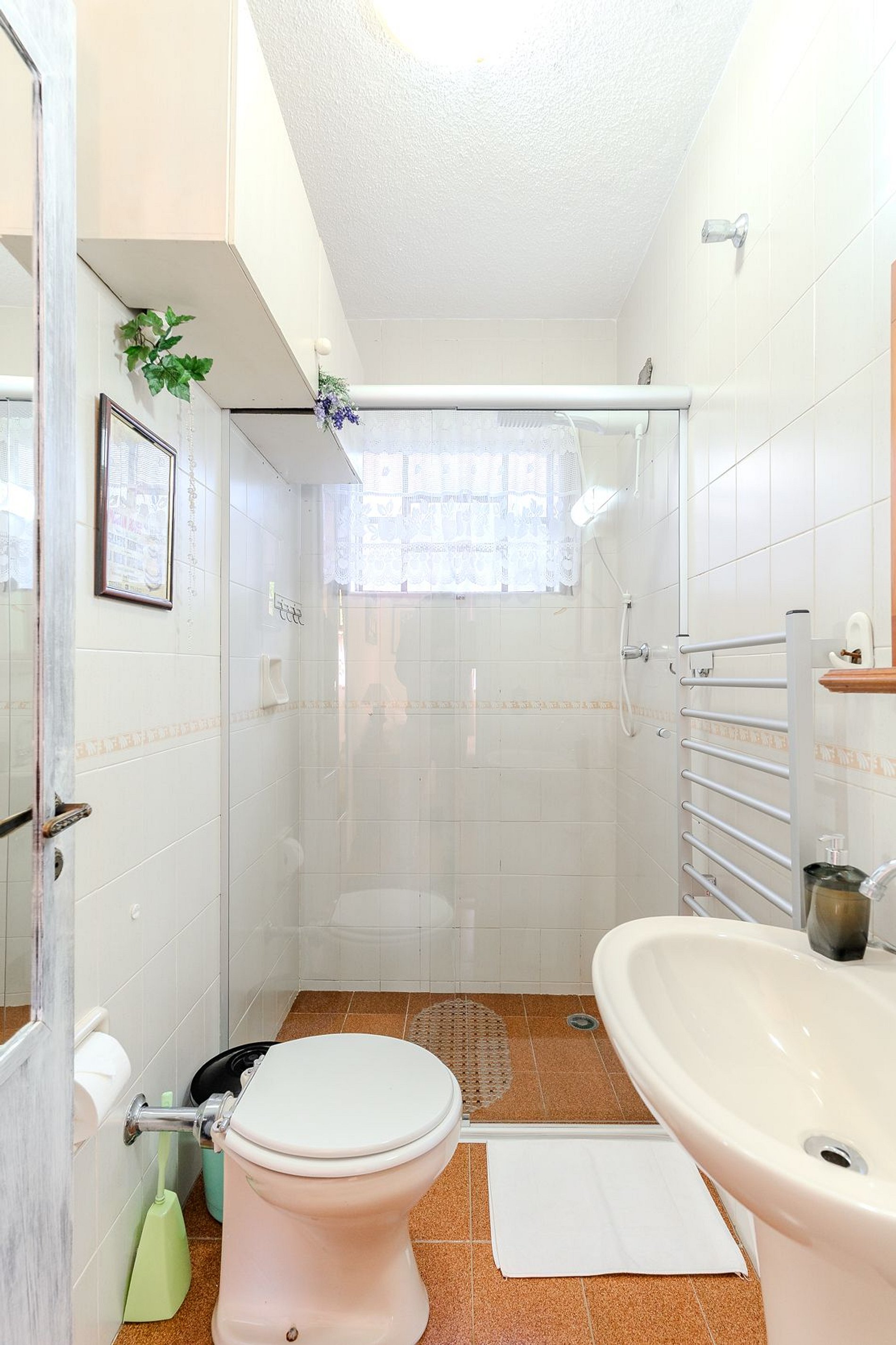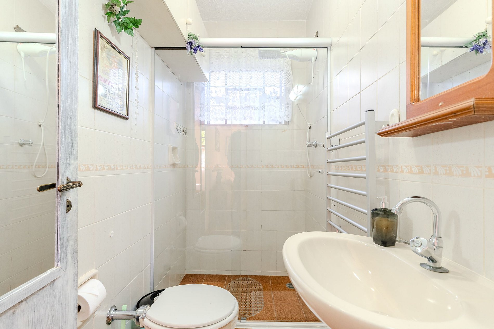 O banheiro está equipado com secador de toalhas e chuveiro elétrico.