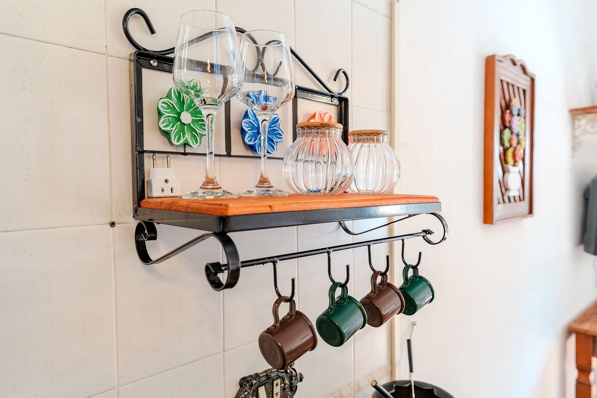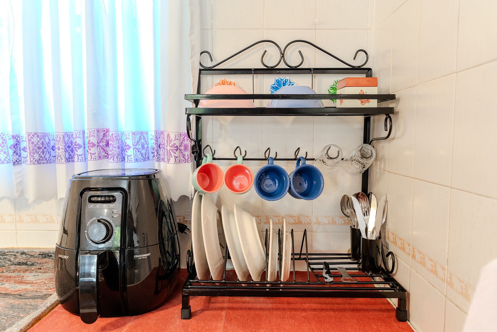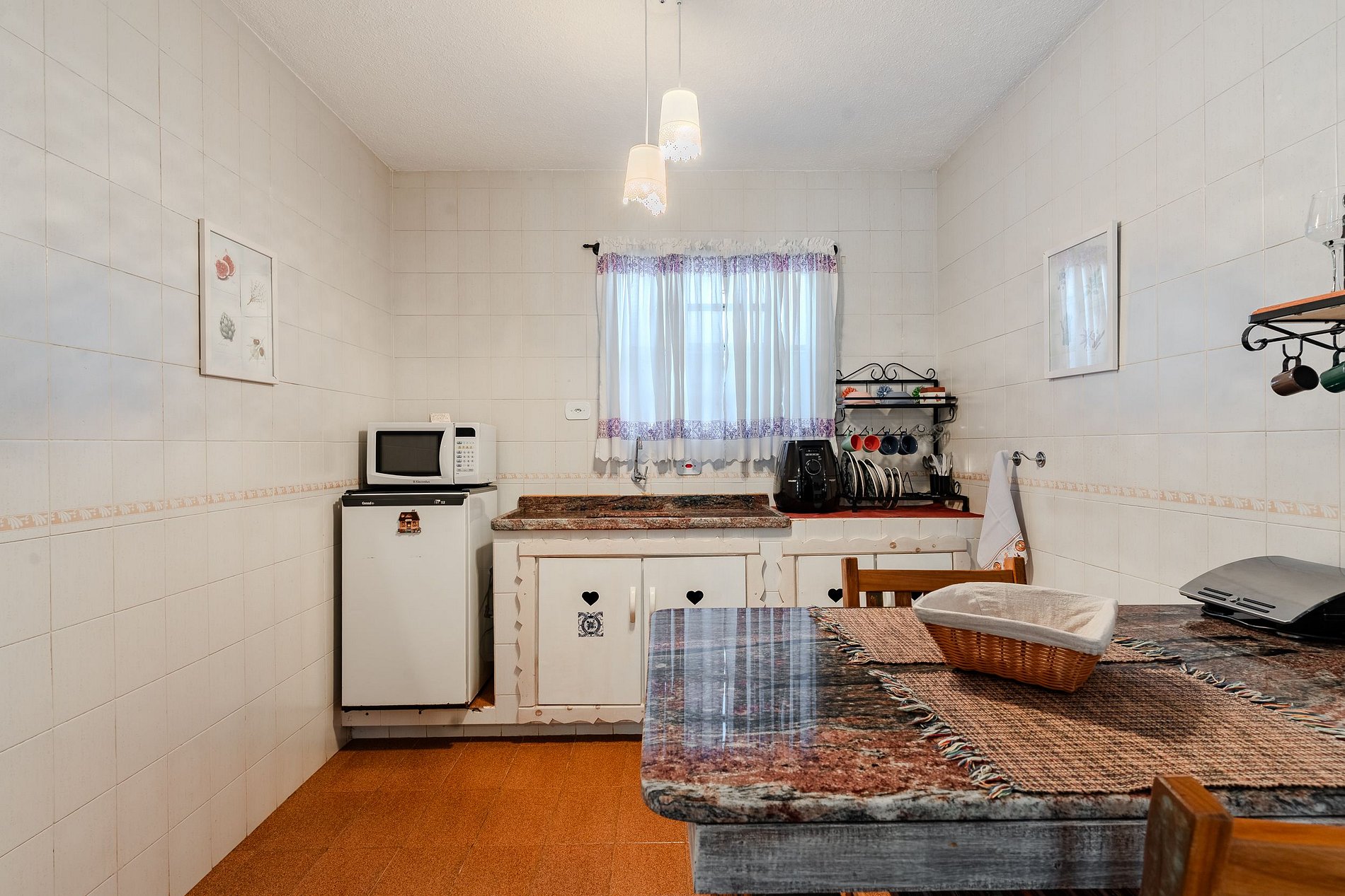 A cozinha está preparada com forno de micro ondas, Air Frier, sanduicheira, cafeteira e utensílios básicos para que o hóspede tenha opção de preparar lanches. Não possui fogão.