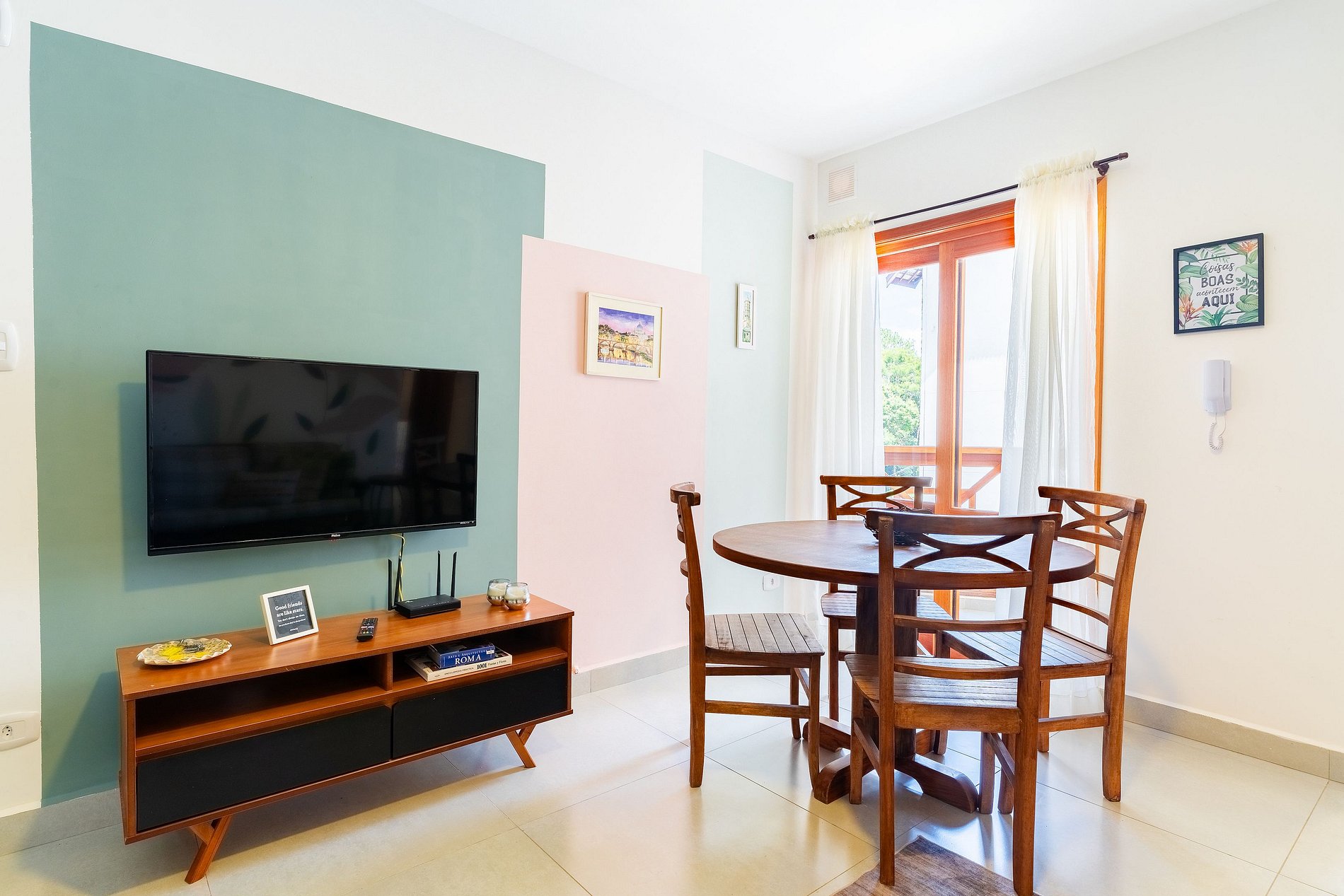 Sala com Smart TV, rede Wi-fi e varanda. Quartos com varanda compartilhada.