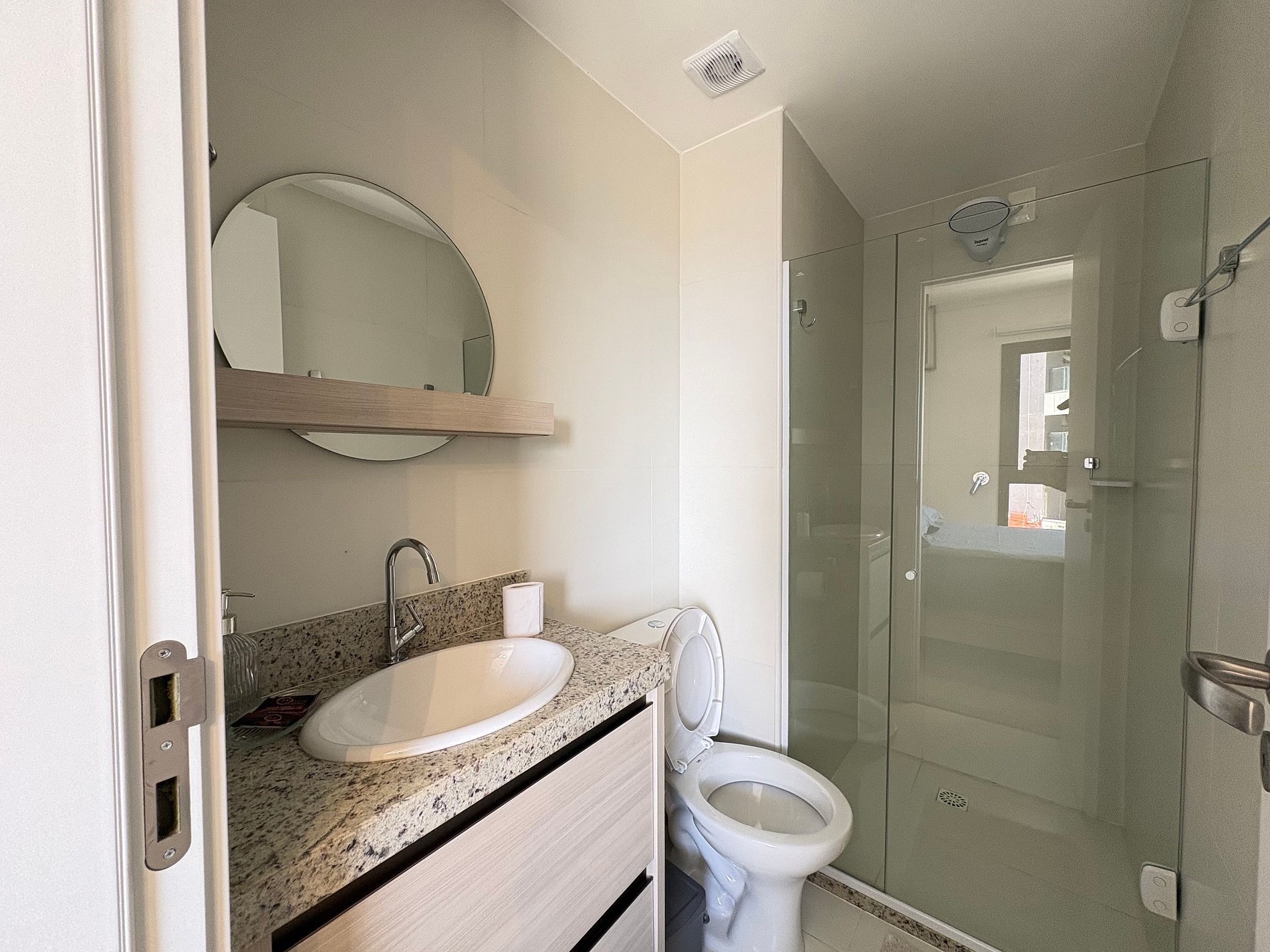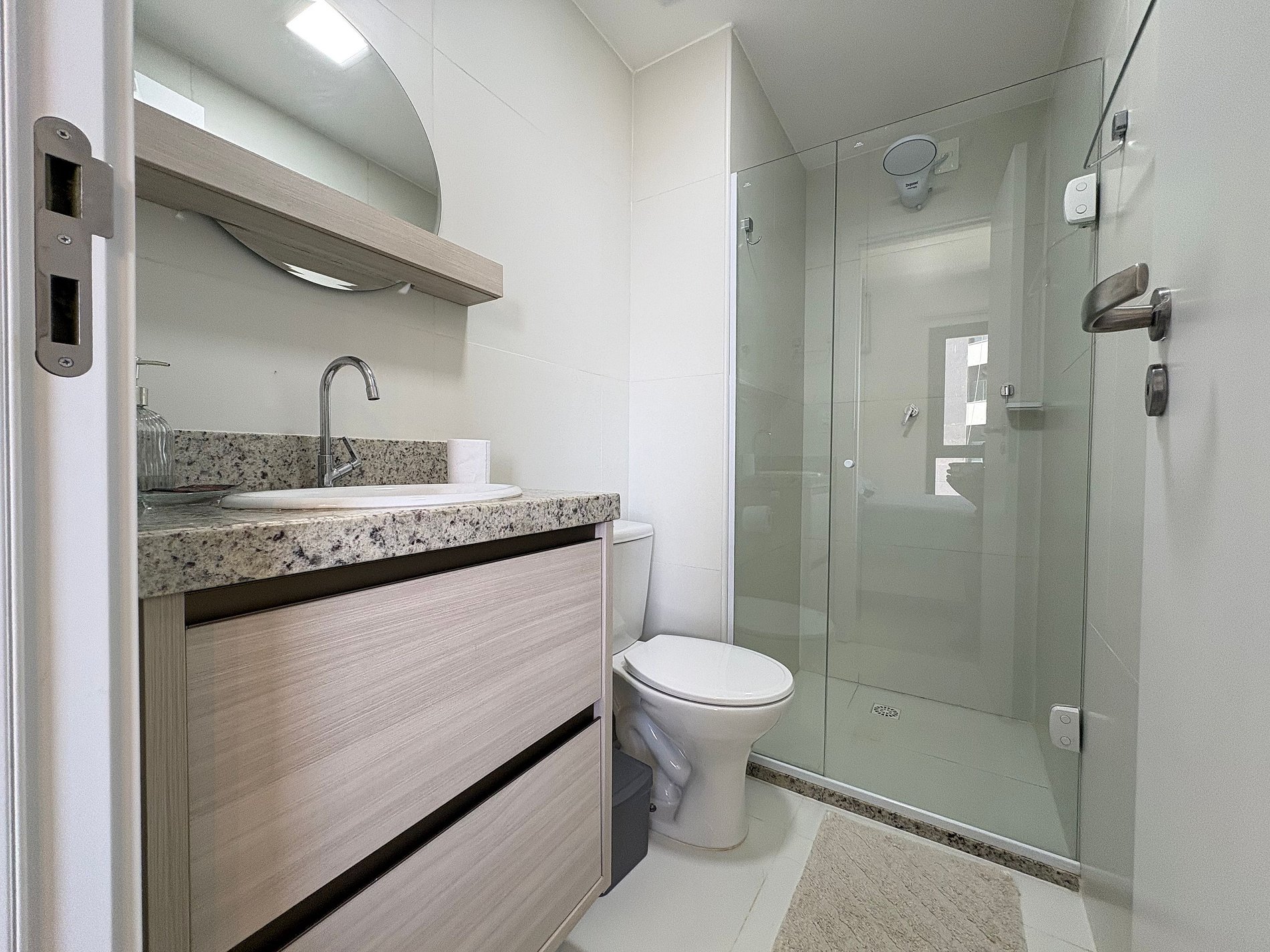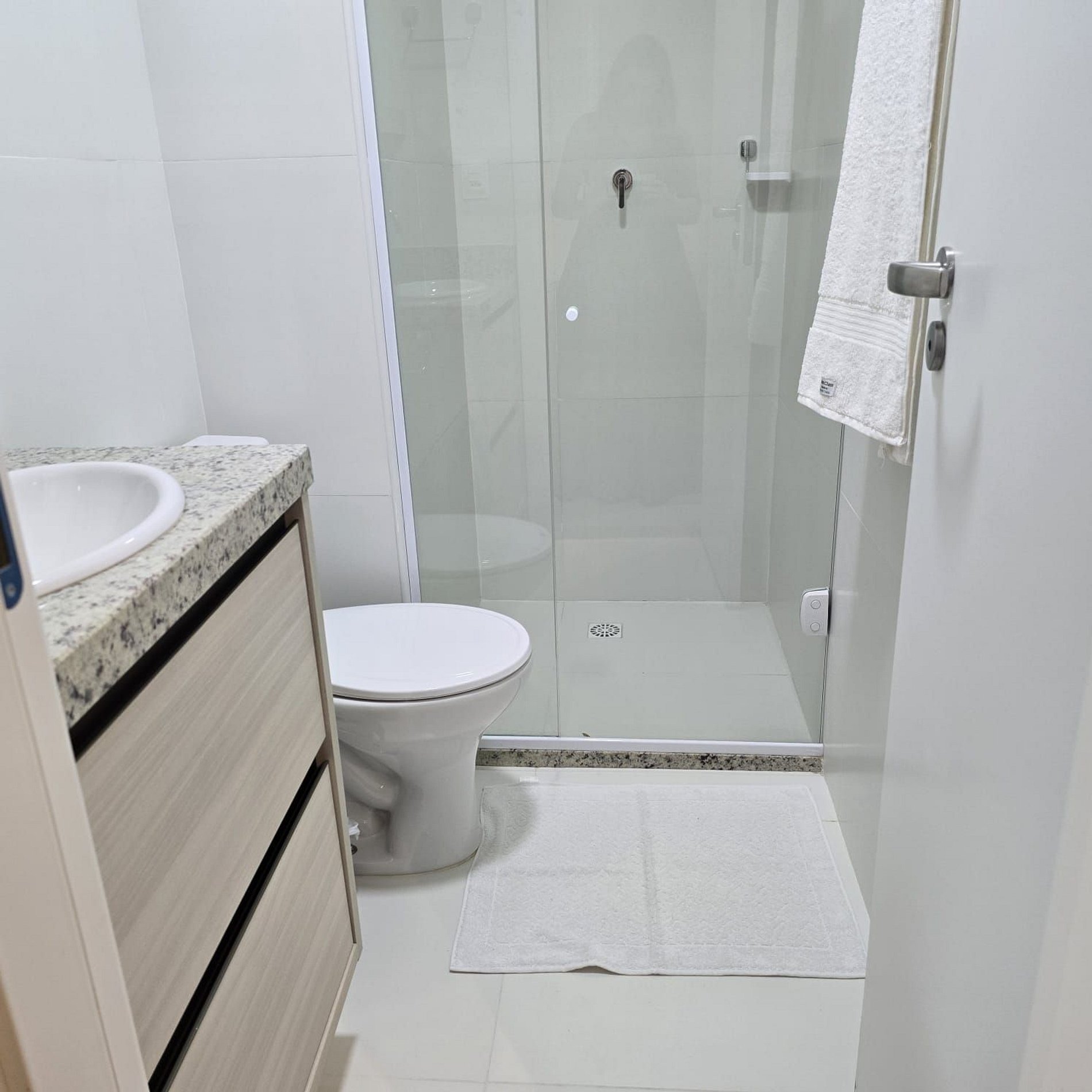 O banheiro está equipado com chuveiro elétrico.