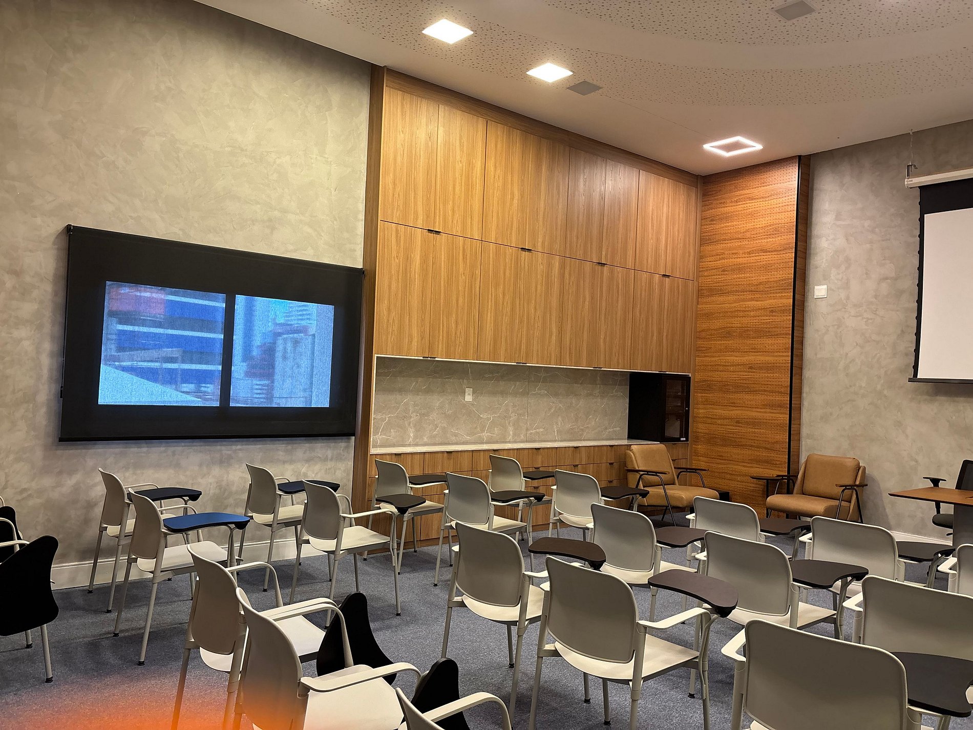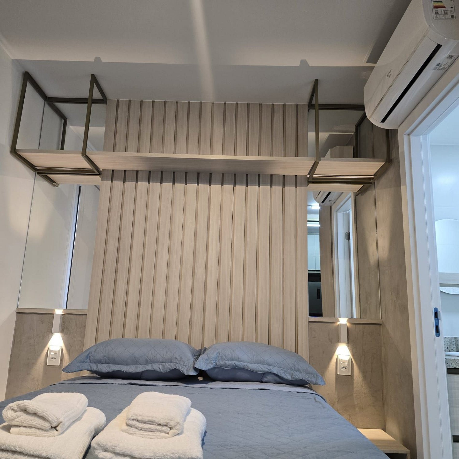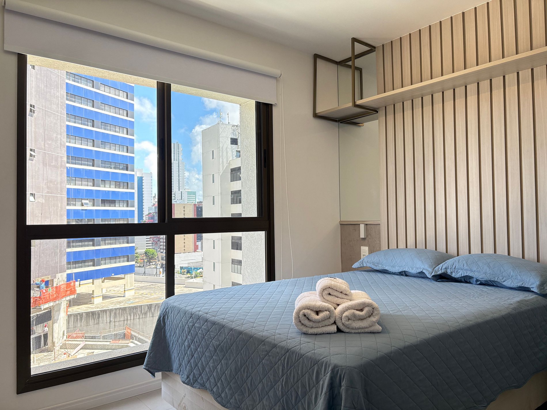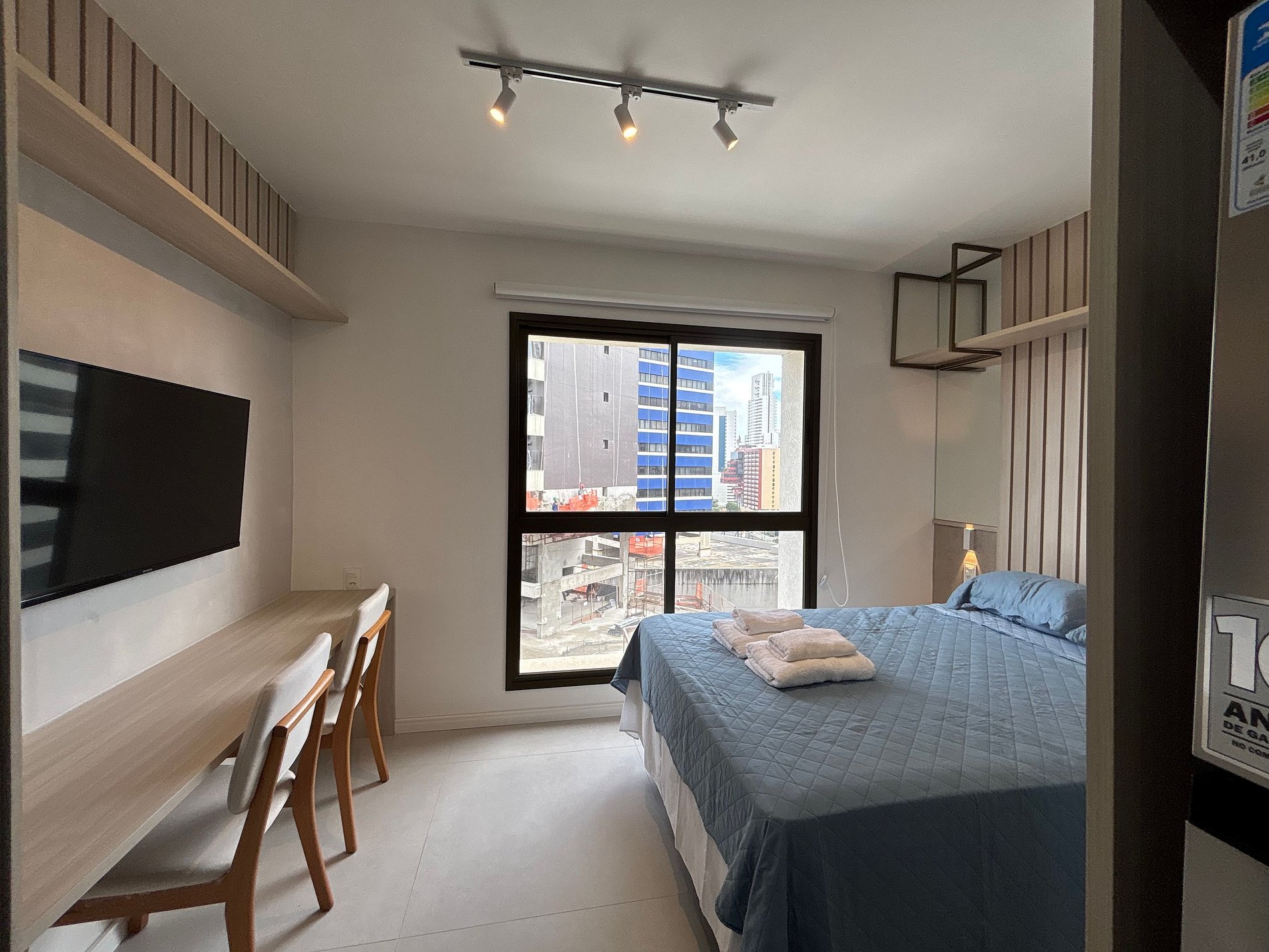 O studio conta com uma cama de casal tamanho padrão, persiana Roll-on Blackout, smart TV e ar condicionado.