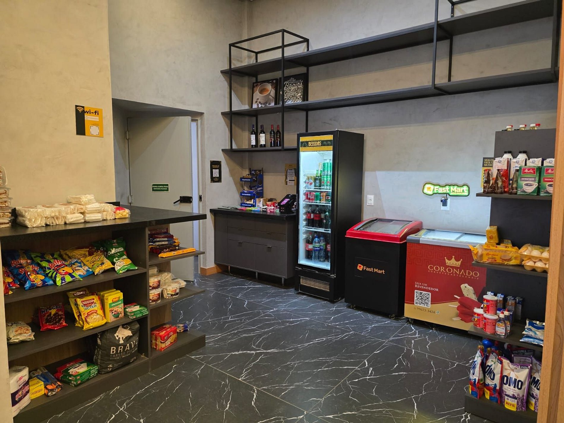 Oferecemos cafeteira, liquidificador, sanduicheira, chaleira elétrica e jogo de panelas próprios para indução.