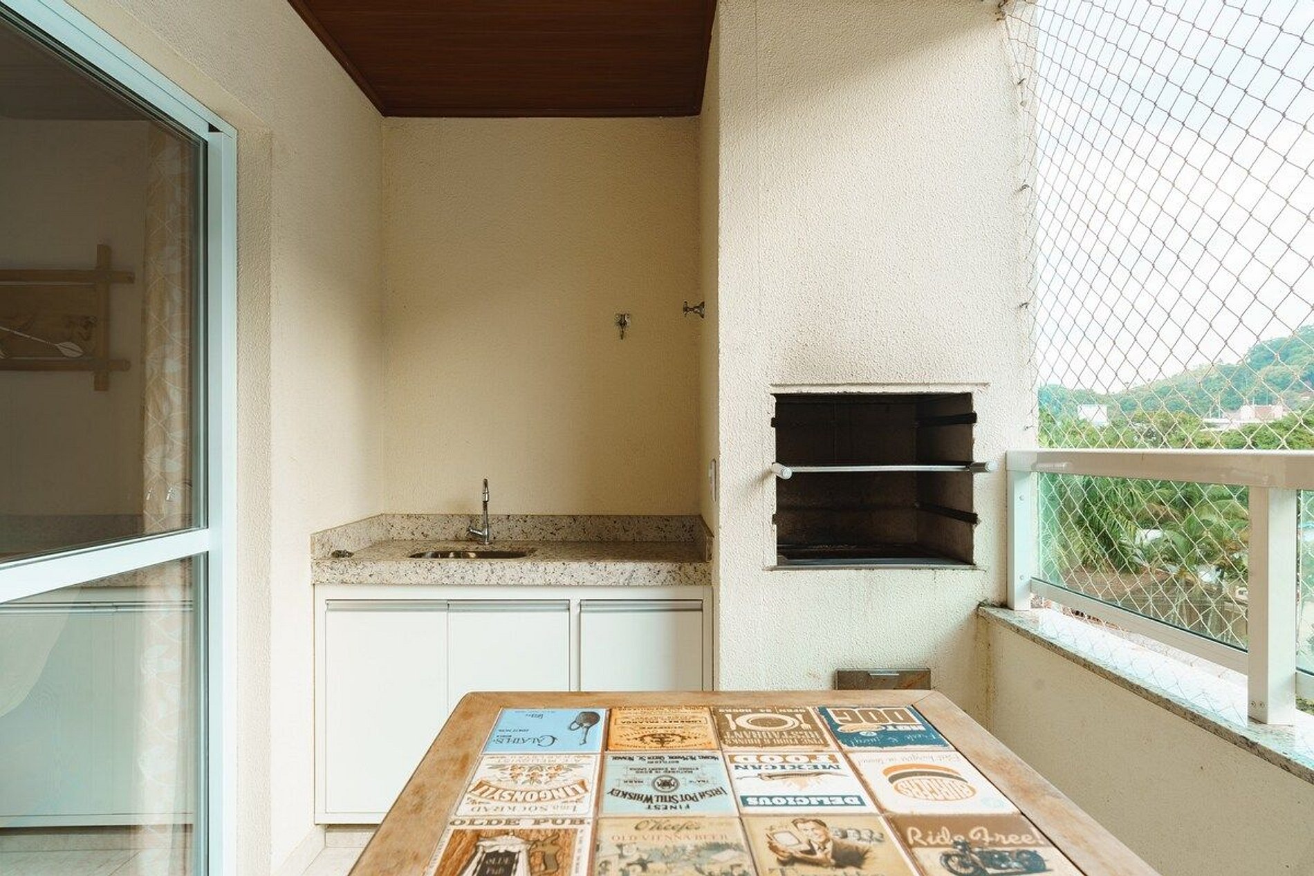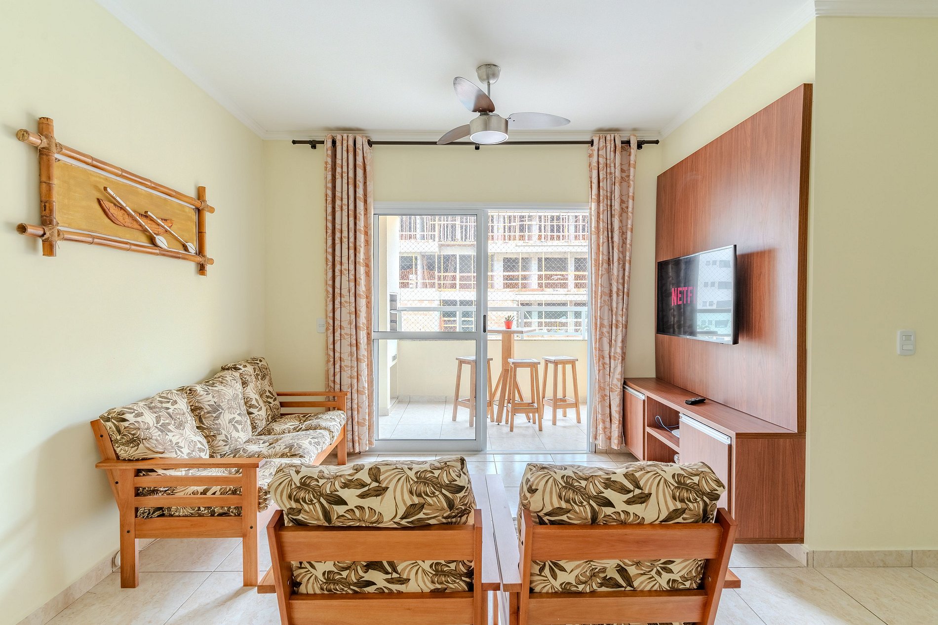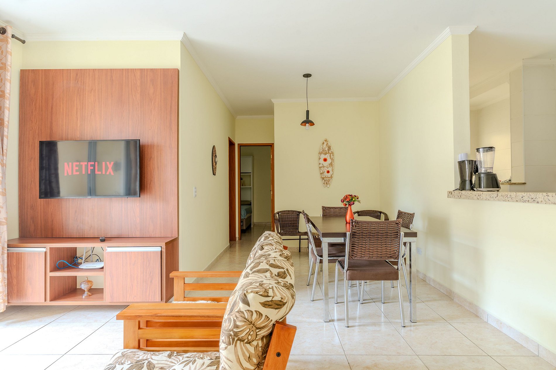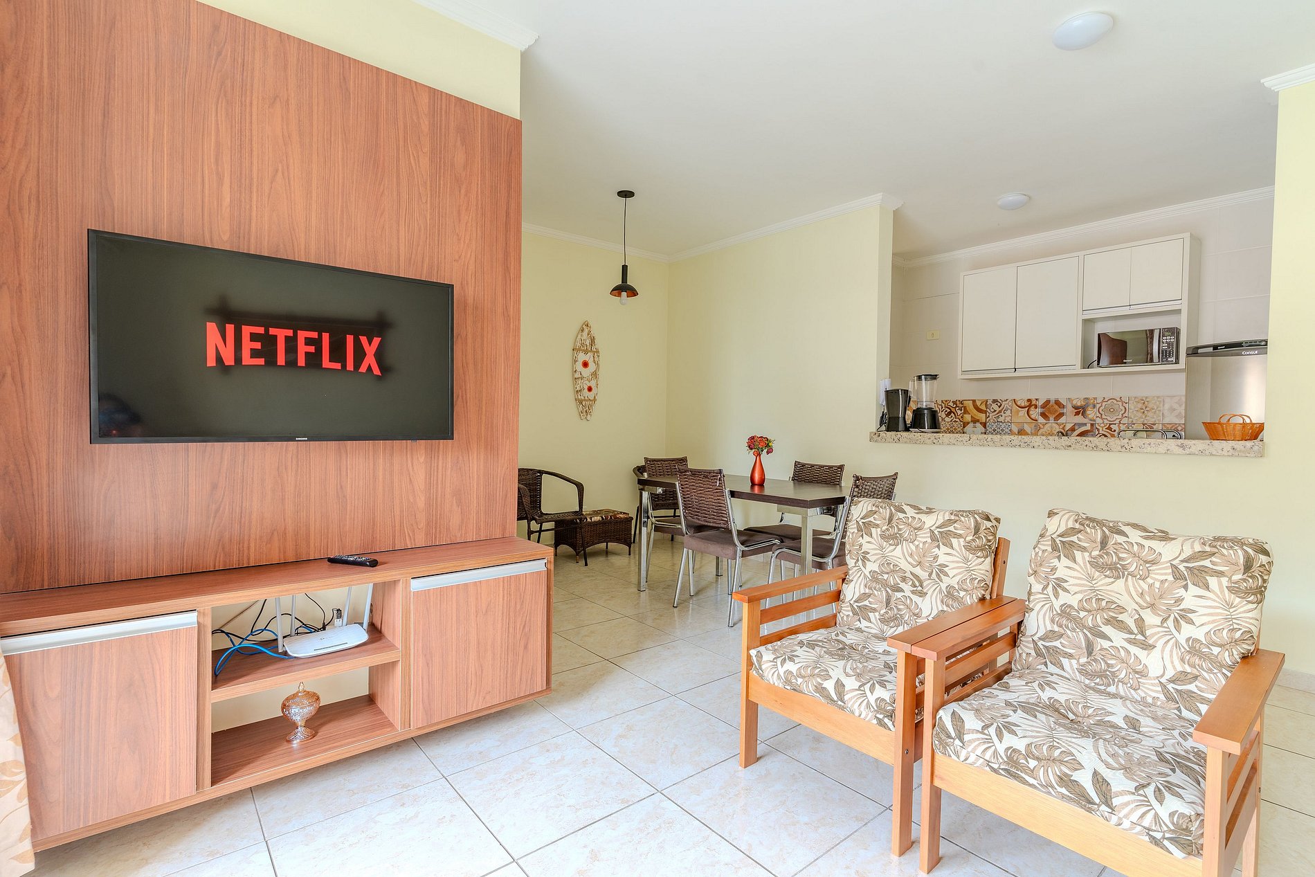 Sala com mesa de jantar, poltronas de madeiras, Smart TV e wi-fi, sacada gourmet com churrasqueira.